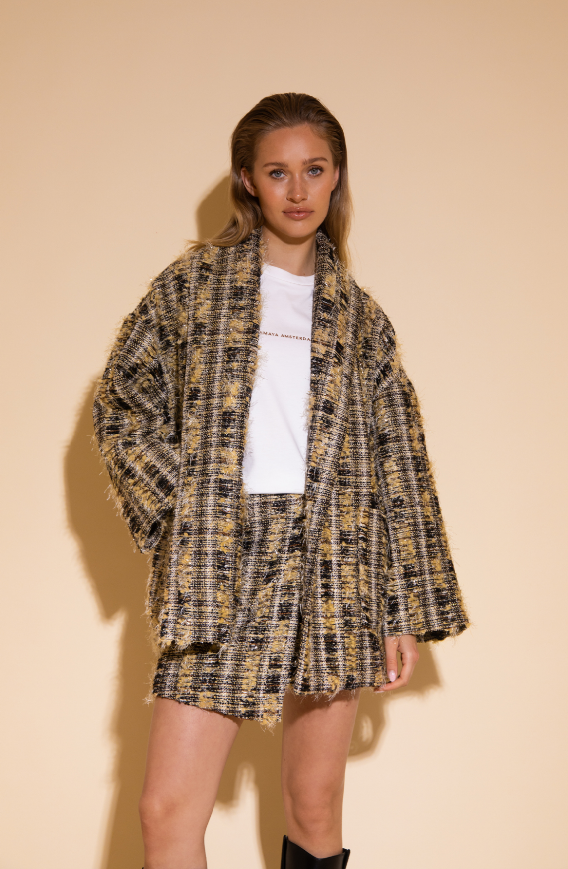 Productinformatie: Een statement piece met een klassieke flair, het Mira Jacket. Deze goud-zwarte bouclé jas straalt elegantie uit dankzij de rijke textuur en ruwe afwerking. De rechte snit en open voorkant geven het jasje een moeiteloos luxe gevoel – ideaal voor zowel kantoor als avondjes uit. Twee ruime zakken aan de voorkant en een brede omgeslagen kraag.
