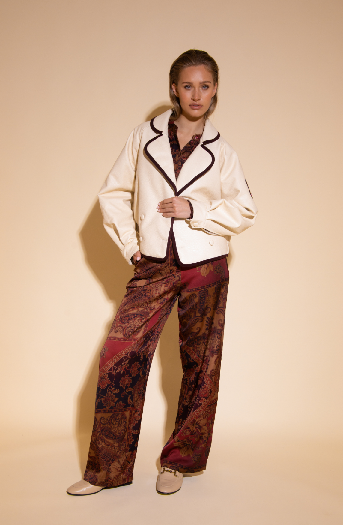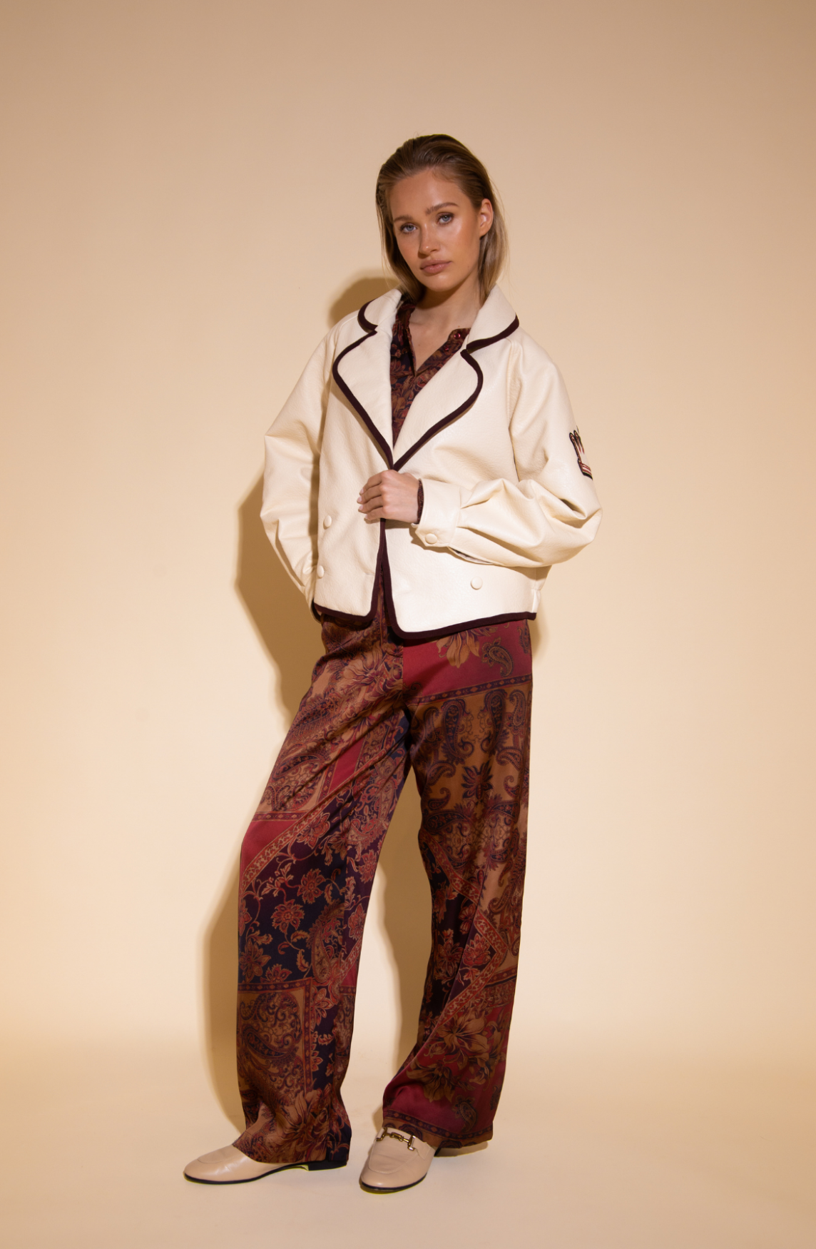 Product information: Feeling like a true Queen! The Crown Jacket is an oversized, boxy jacket. The faux leather off-white material is soft and supple. On the side of the left sleeve a crown emblem. At the front the jacket can be closed with the buttons. The jacket has a collar and the entire seam is finished with a burgundy red piping. The jacket is lined and padded.