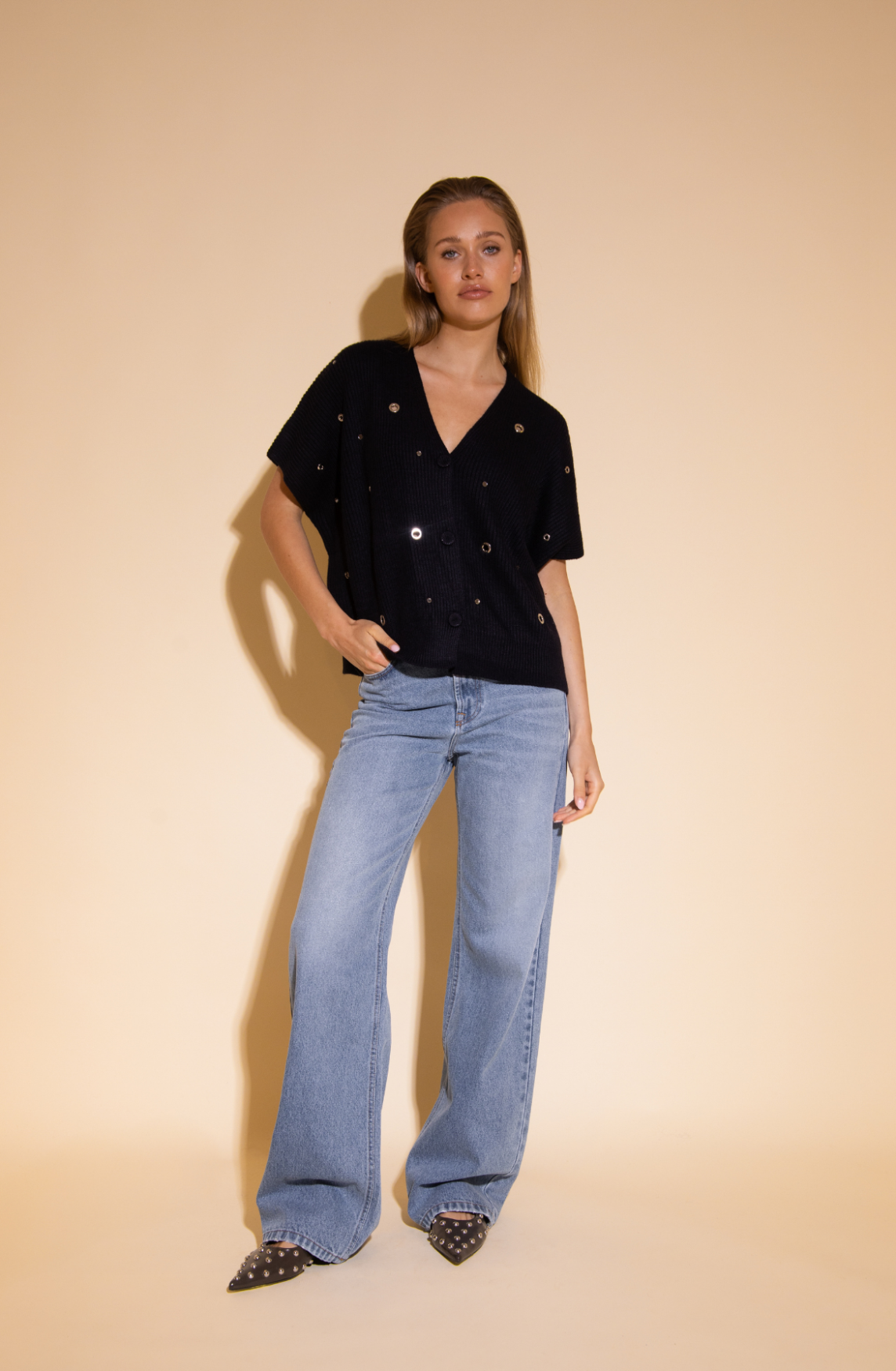 Product information: The Liv Knitwear is a spencer gilet. The Liv Knit is available in two colours, beige and dark blue. Overall you see the steel eyelets, this gives a playful and unique effect to the knit.
