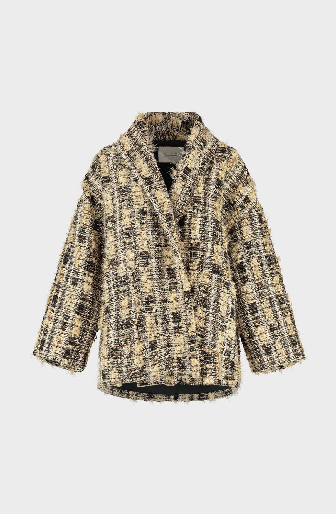 Product information: A statement piece with a classic flair, the Mira Jacket. This gold-black bouclé coat exudes elegance thanks to its rich texture and raw finish. The straight cut and open front give the jacket an effortlessly luxurious feel – ideal for both the office and nights out. Two spacious pockets at the front and a wide turn-down collar.